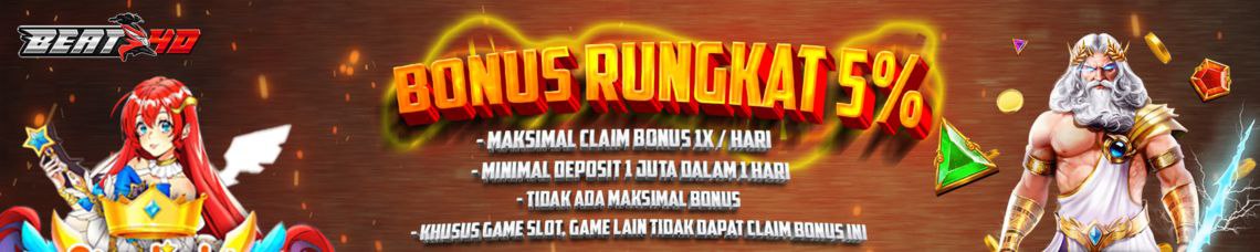 5. Tidak ada batas maksimal Bonus , Dalam satu hari pemain hanya bisa claim bonus Rungkat sebanyak 1x contoh : total keseluruhan deposite player sebesar Rp 5.000.000 Rp 5.000.000 x 5% = Rp250.000 adalah Total bonus yang di dapatkan.